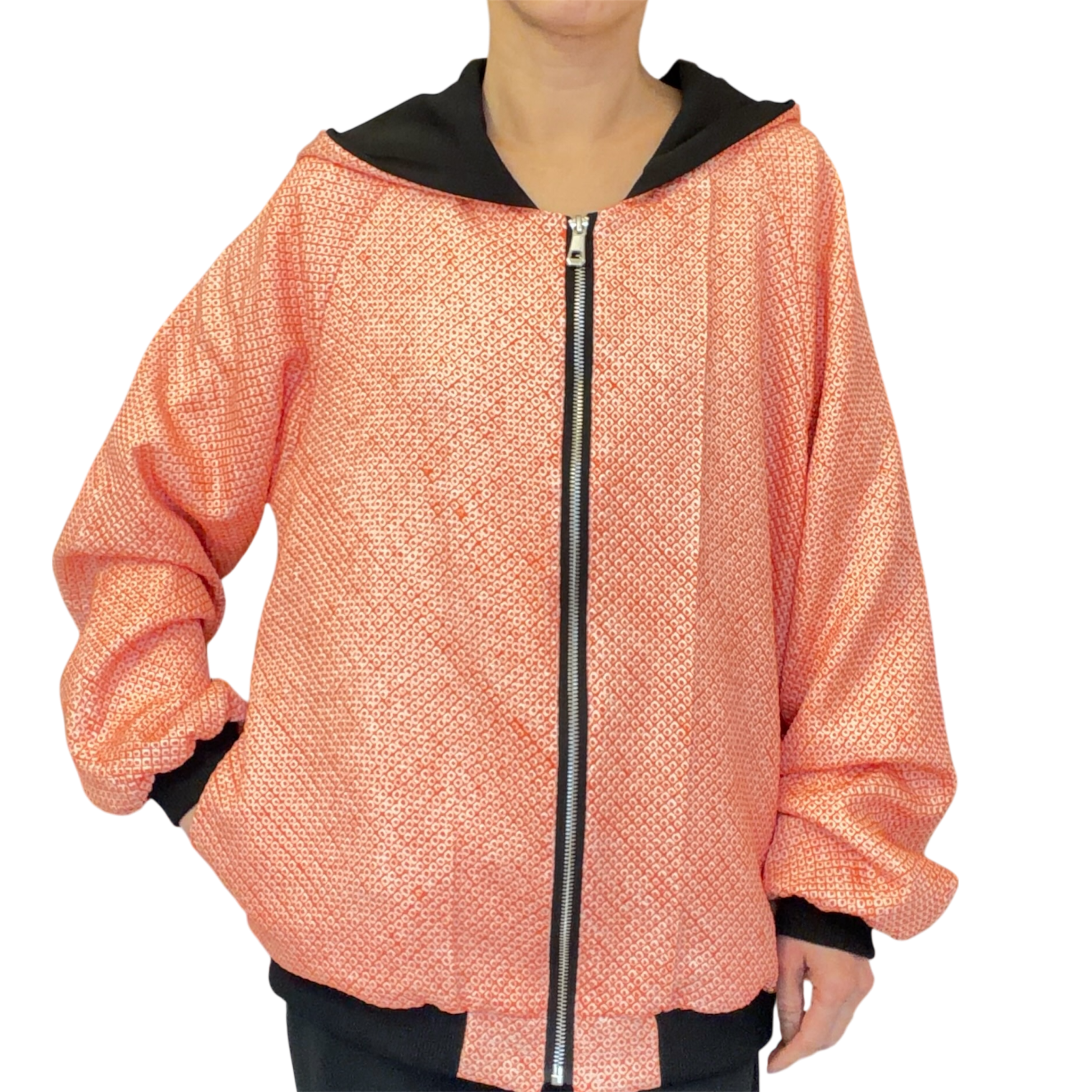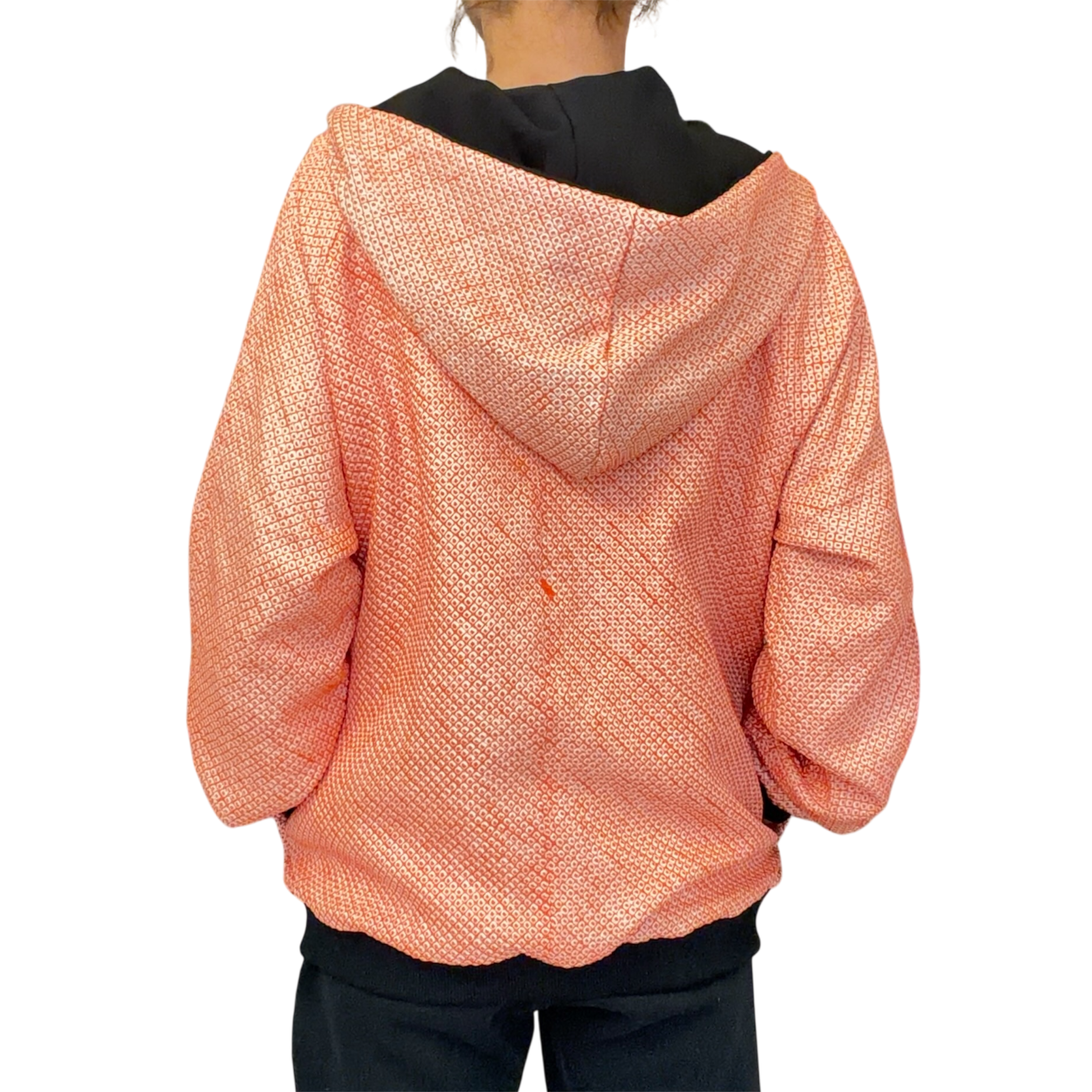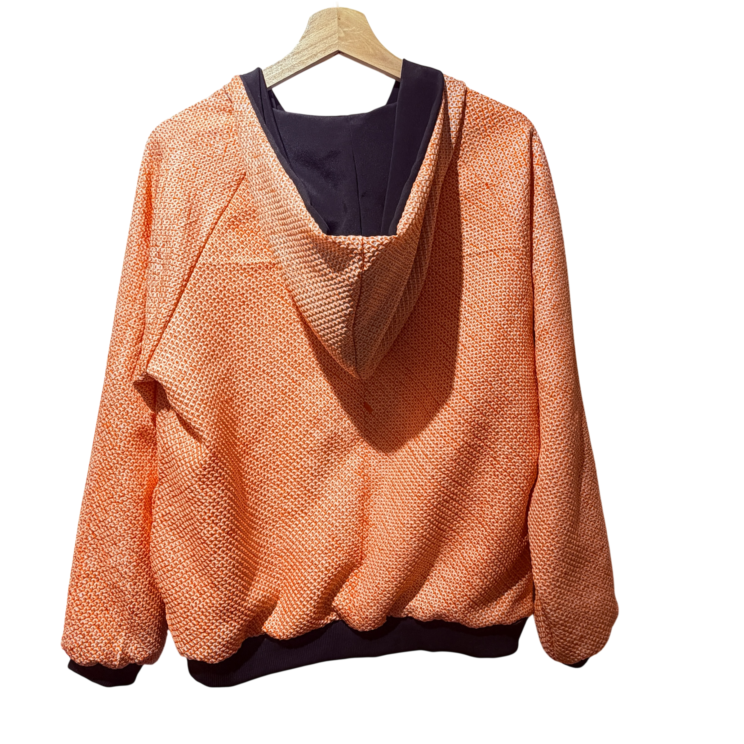 Pièce unique upcycled à partir d’anciens Haori shibori, orange avec intérieur noir, taille unique 36–42, style unisexe. Soie douce, fermeture éclair, moderne et artisanale. Demi-luxe