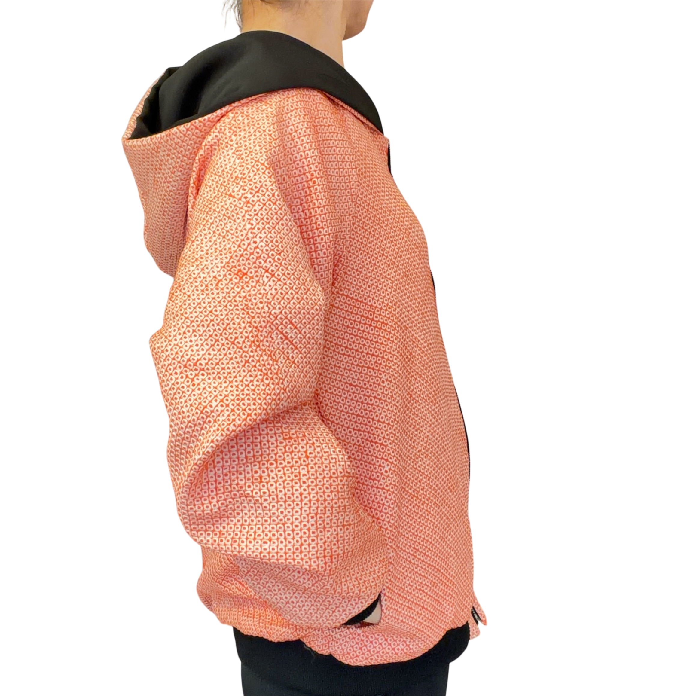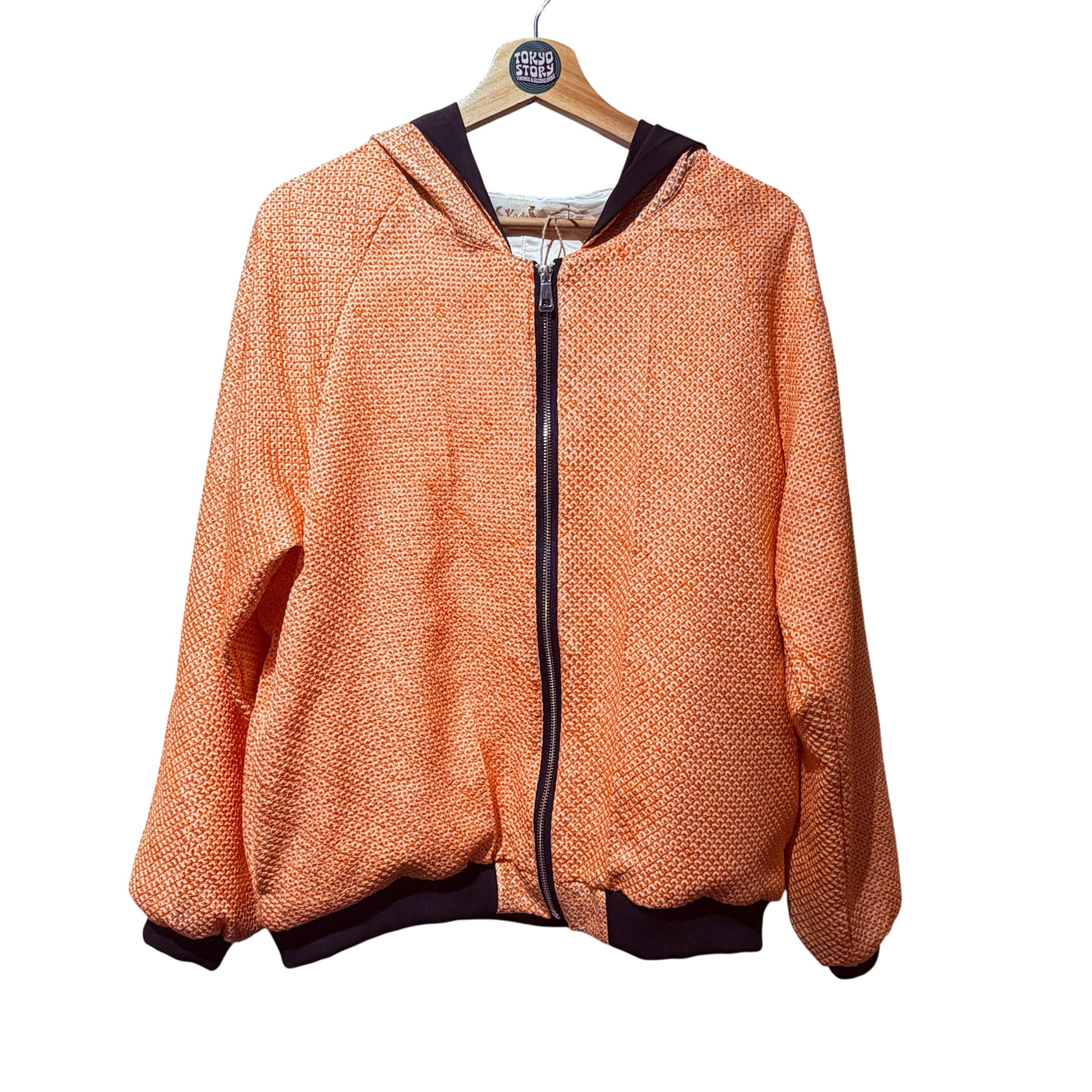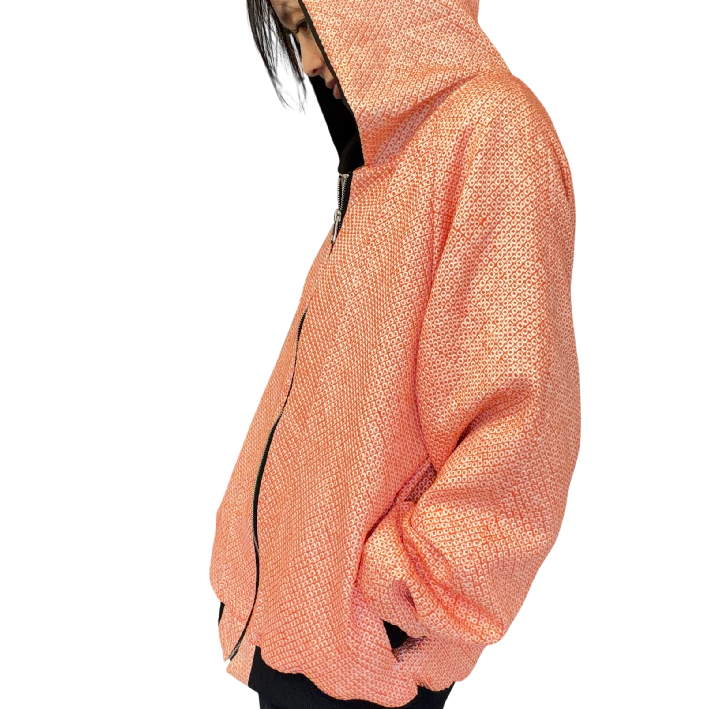 Pièce unique upcycled à partir d’anciens Haori shibori, orange avec intérieur noir, taille unique 36–42, style unisexe. Soie douce, fermeture éclair, moderne et artisanale. Demi-luxe