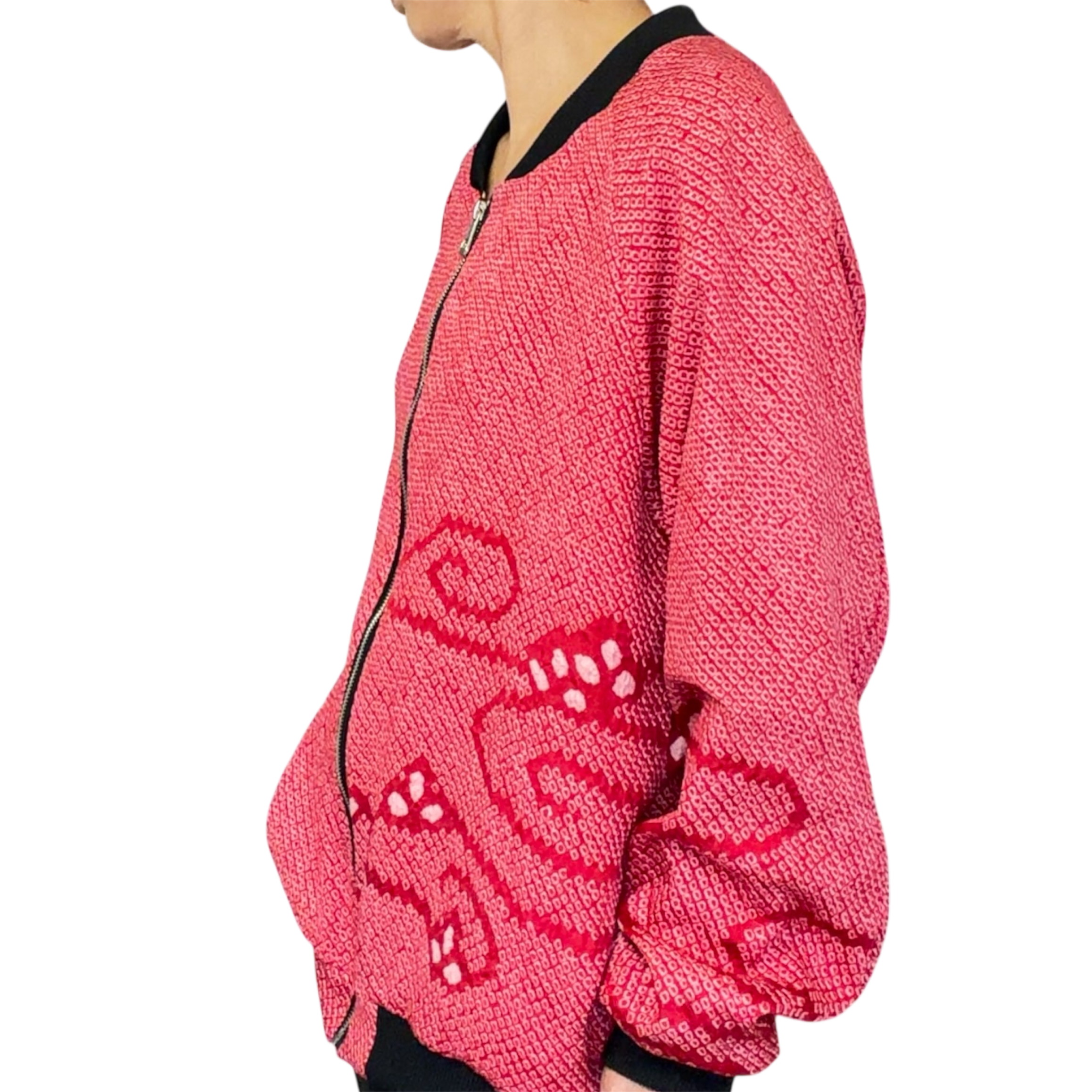 Cette pièce unique est upcycled à partir d’anciens Haori shibori, décousus et recréés à la main pour une veste moderne et originale. Couleur rouge éclatante, fermeture éclair, chaque bomber raconte une histoire et allie style contemporain et héritage japonais.