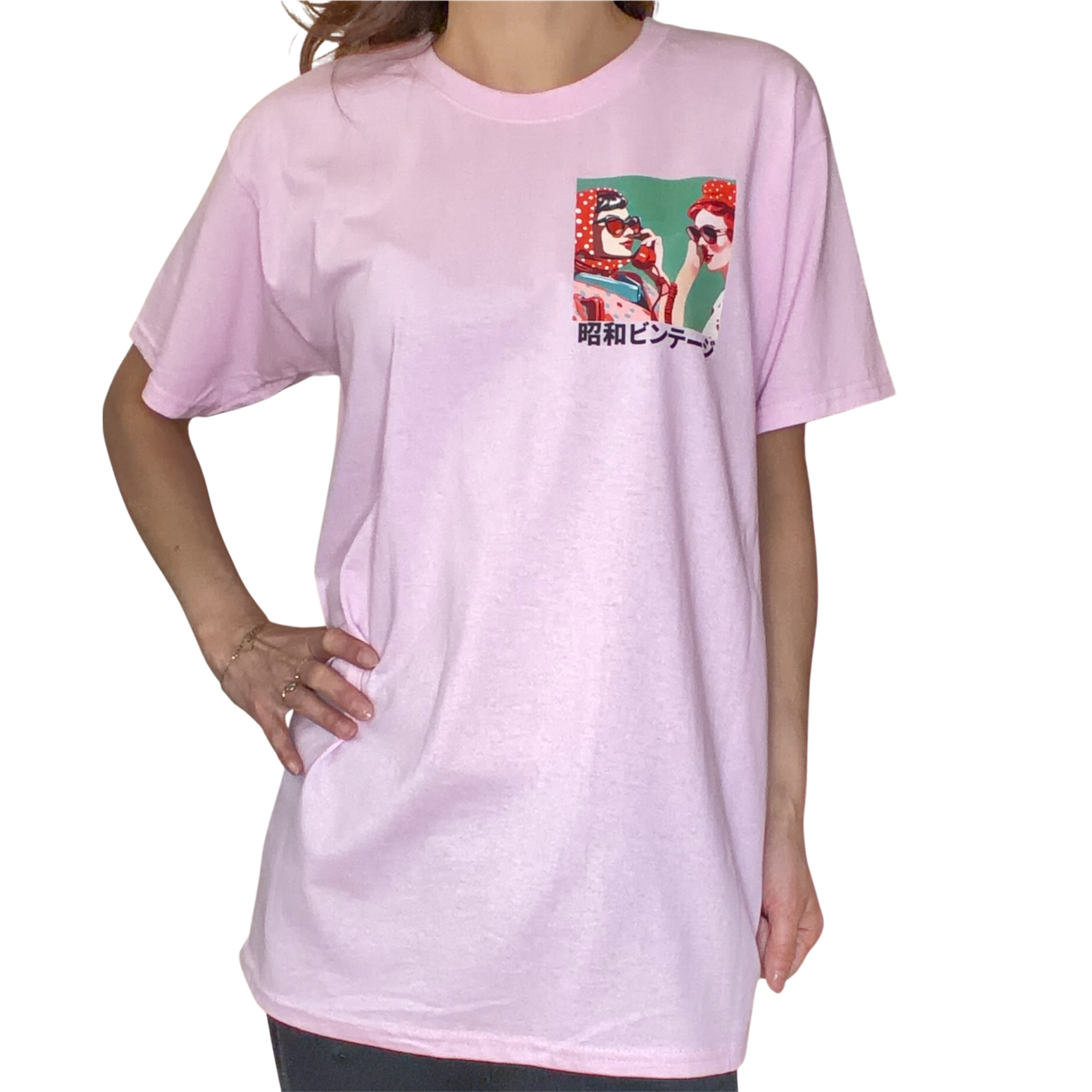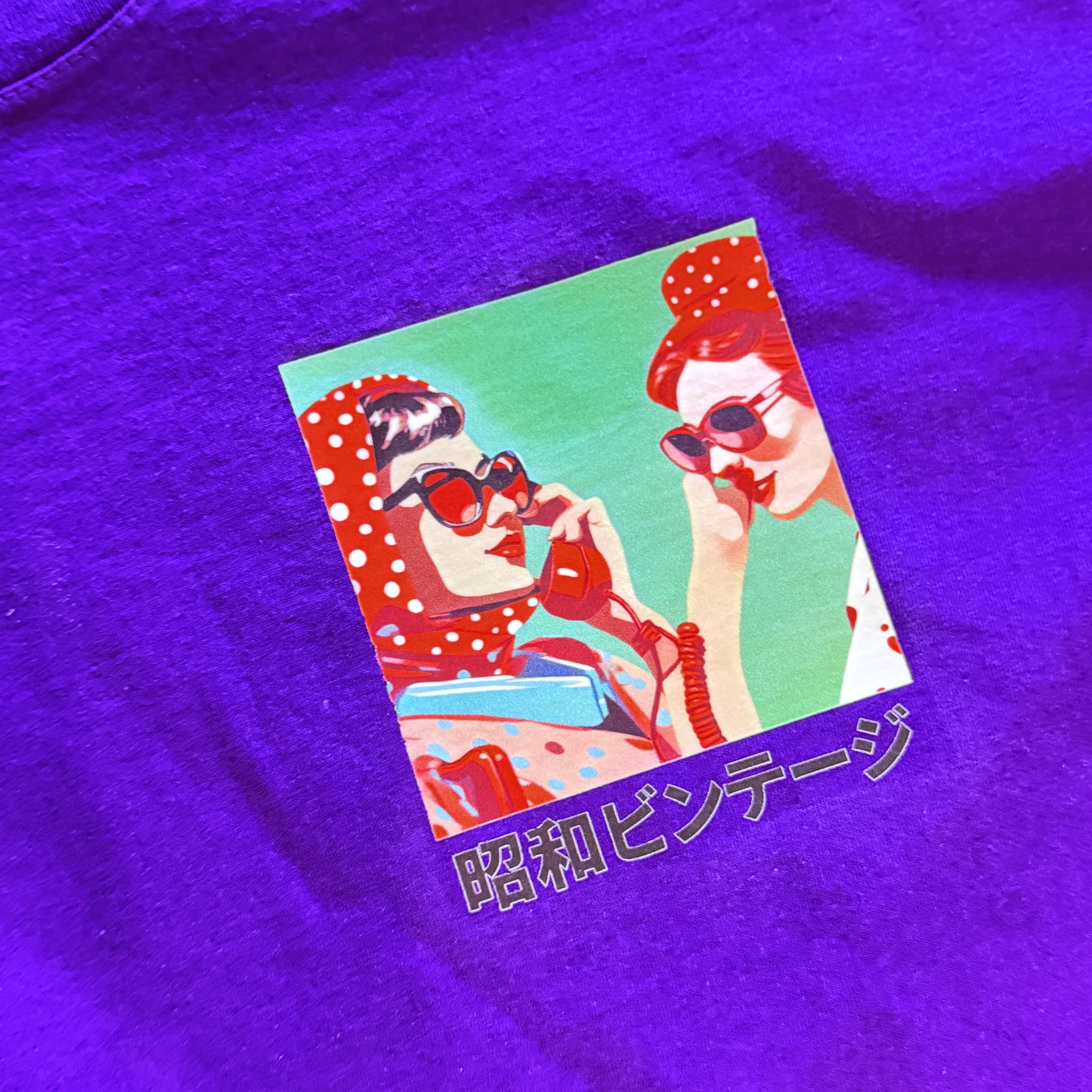 T-shirt confortable avec un design vibrant sur la poitrine : deux filles coiffées de foulards à pois et lunettes de soleil, discutant avec un téléphone rétro. Inspiré du style pop des années 80, ce T-shirt coloré célèbre l’époque Showa avec une touche vintage et fun.